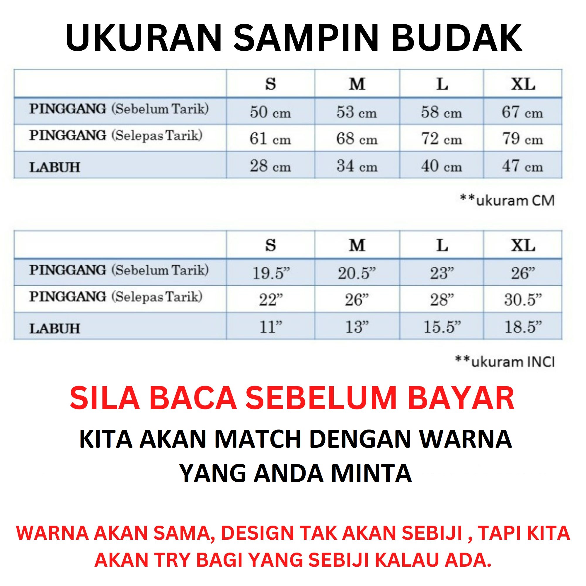 DEWASA 2.25m, DEWASA 2m, L ( 8 – 9 TAHUN ), M ( 5 – 7 TAHUN ), REMAJA (11 – 14 THN), S ( BAYI – 4 TAHUN )